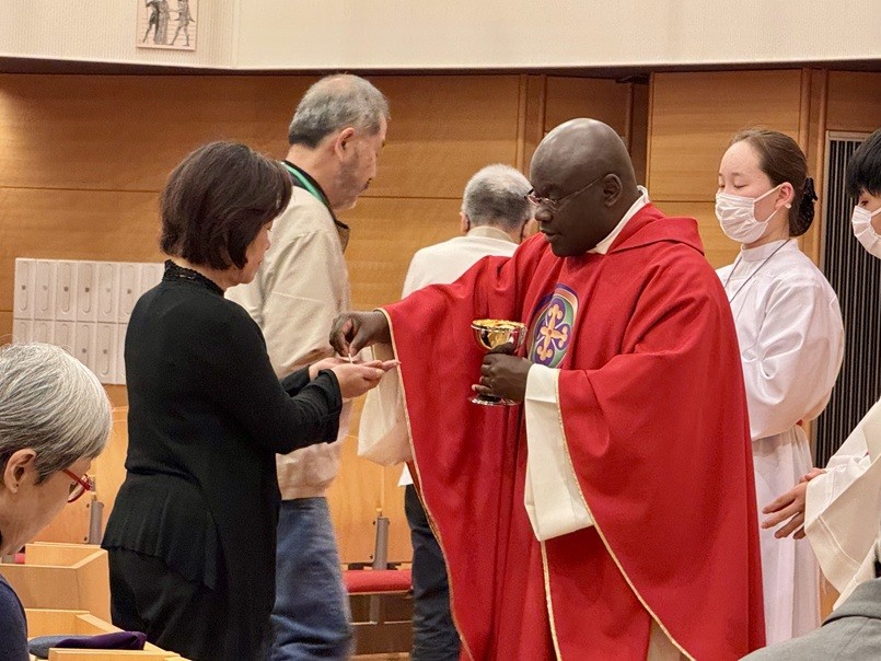 続いて、盛式共同祈願が行われ、十字架の顕示が始まります。司祭が十字架を高く掲げ、歌いながら十字架にかけられた布を外して祭壇に運びます。顕示の後、皆で十字架を礼拝し、主の受難を思いながら静かに祈ります。私たちはイエス様を十字架にかけたのは私たち自身であることを認識し、深い祈りの中でその意味を噛みしめます。