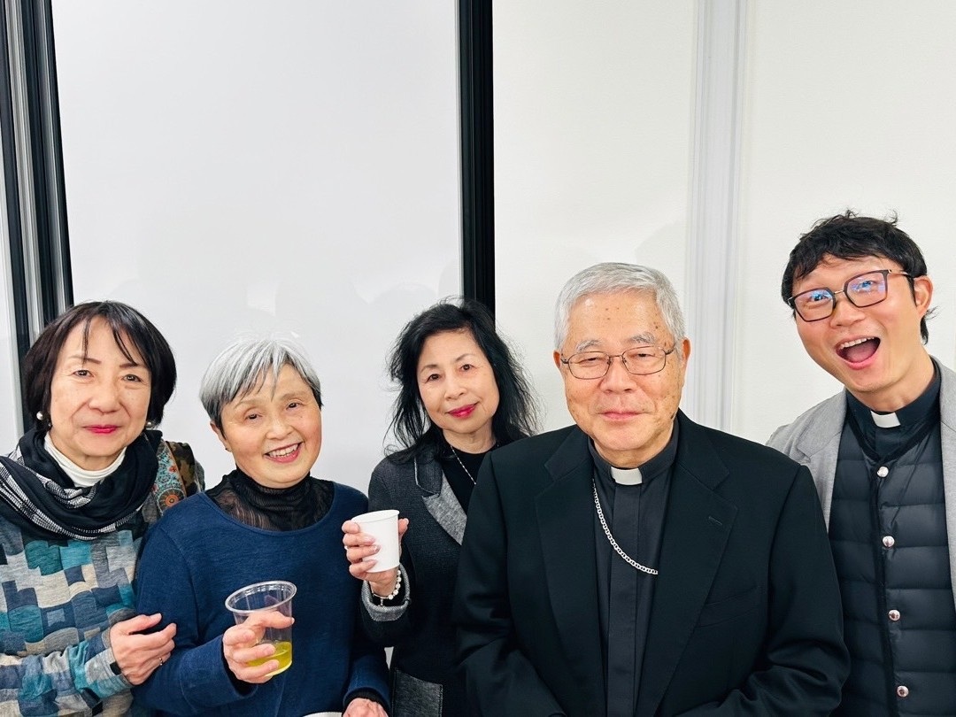 ミサ後お祝い会がありました。金祝の前田枢機卿を囲んで、ペトロ金神父様と住吉教会からの出席者が収まっています。谷澤さんと南浮さんは聖香油を受け取るため、吉川さんは手話通訳を担当されました。